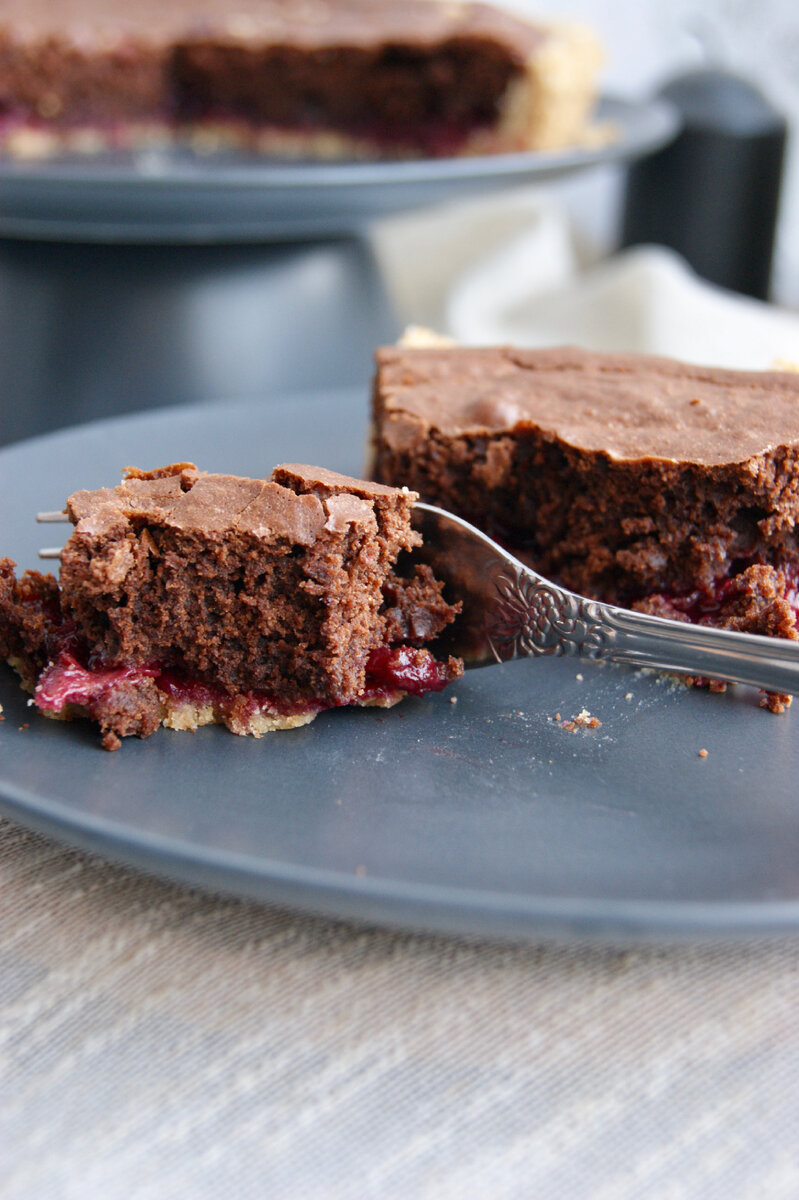 Тонкий слой хрустящего песочного теста, на котором притаилась сочная вишня, укутанная шоколадным брауни 🤤
