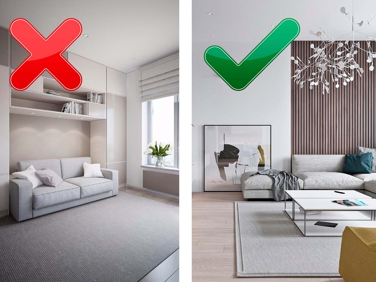 Никогда так не делайте: самые частые ошибки в интерьере квартиры Cамый дорогой и стильный ремонт может пострадать от нескольких неосторожных штрихов. Важно грамотно выдержать гармонию фактур, цвета и материалов. Ниже - примеры типичных ошибок в интерьере. Поставить всю мебель вдоль стен Казалось бы, это самый простой способ оставить максимально много свободного пространства. Но на практике такие интерьеры выглядят пусто и неуютно. Попробуйте поиграть с пространством: зонируйте комнату с помощью дивана или стеллажа. Мало места для хранения На этапе планирования пропишите весь функционал будущего помещения. Если это гостиная, вы здесь будете работать, проводить время с друзьями, хранить крупные вещи. Пропишите, какие предметы должны быть на виду, а какие скрыты. Использовать предметы только по одному назначению Найдите нестандартное стильное решение простым вещам. Например, пуф может служить ночным столиком. Книжный стеллаж или диван – отличный способ зонировать пространств