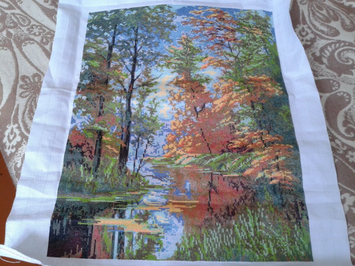 Давным давно примерно 6 лет назад насмотрелась ютуба. Мне очень захотелось вышить большую работу. В это время я была в декрете и не могла позволить себе набор. Нашла на просторах интернета схему Багряная осень. Это был скрин из какого журнала. Закупил нити и канву 11 аккаунта. Очень крупная и в итоге я разочарованна в моем таком выборе. Вышивала с удовольствием. Ни каких таких запинок не было. Работа шла быстро. Почему осень я выбрала. Почему что у меня день рождения осенью. Это время года люблю. Работу я оформила в деревянную светлую раму. Долгое время она у меня висела в комнате. Решила и подарила сестре на день рождения. Ни сколько не жалею об этом. Она мои работы ценит. Делайте своим близким приятное. Шустрой иголочки вам мои читатели.