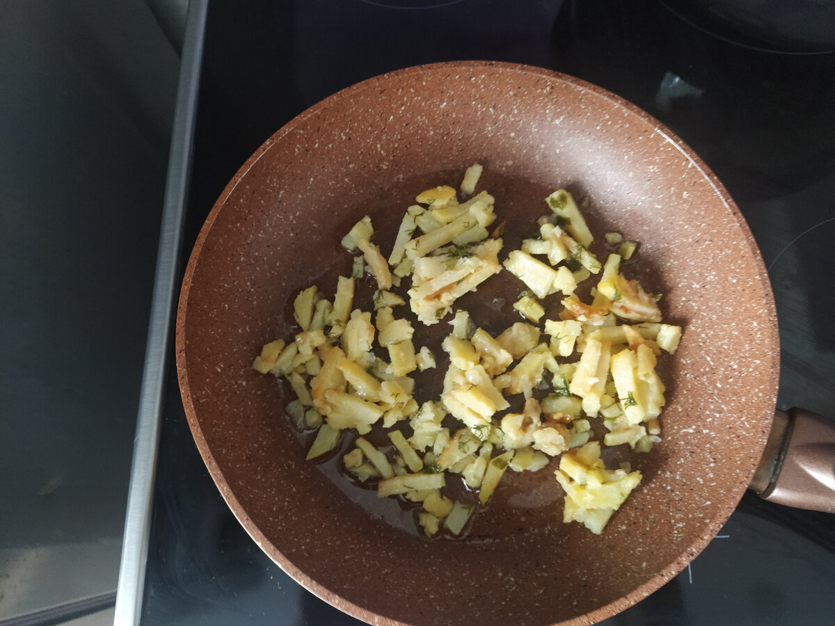 Ставлю сковороду греться и добавляю немного подсолнечного масла. Далее отправляем разогреваться картошку. Пока картошка греется, режу мелко колбасу и помидорку, взбиваю яйца.