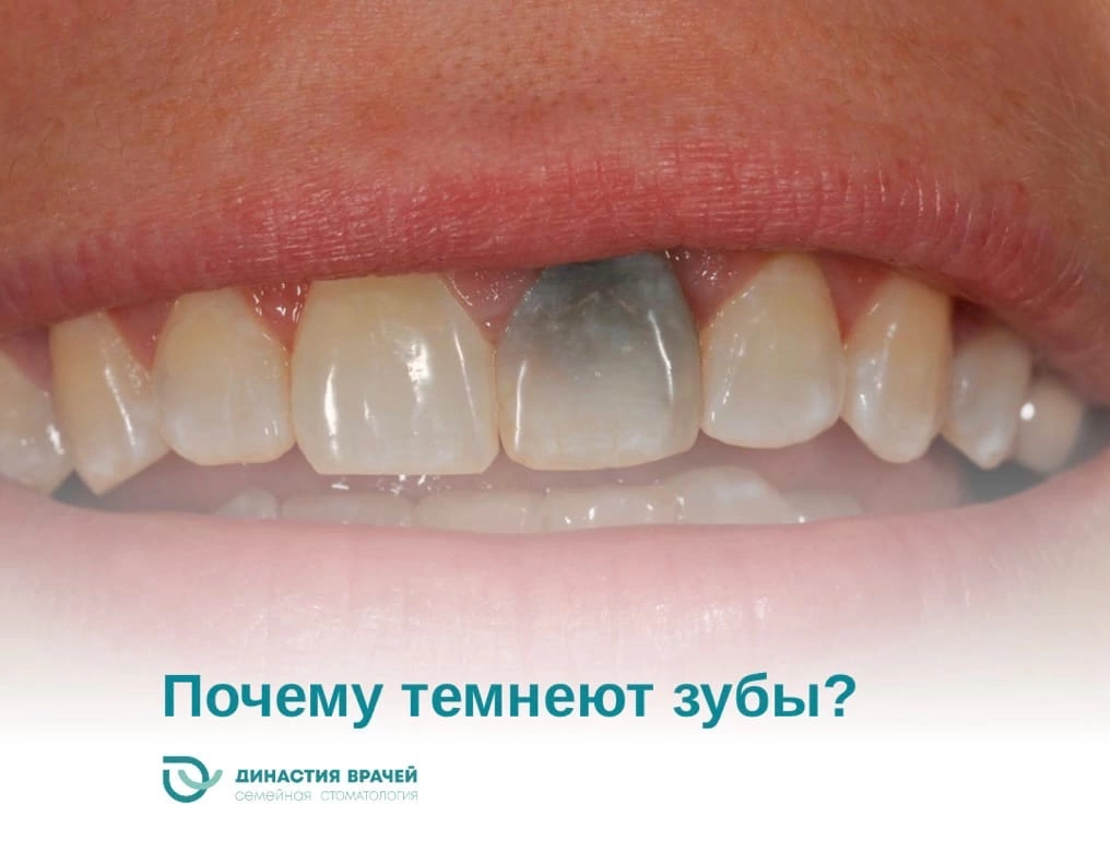 Черные пятна на эмали обычно ассоциируются с кариесом. Хотя на самом деле изменение цвета не всегда связано именно с ним. Зубы могут почернеть от множества других факторов, в том числе и изнутри. В этом случае лучше обратиться к стоматологу — он выяснит точную причину изменения цвета и составит план лечения. А вот некоторые из причин: Травма зуба Из-за сильного удара происходят микротравмы и разрывы сосудов пульпы, которые через некоторое время могут привести к потемнению зуба. Удаленный нерв После лечения пульпита, когда врач удаляет нерв и чистит каналы, зуб становится хрупким, а эмаль — пористой. Она хорошо впитывает красители, и зуб постепенно темнеет. Кариозная полость Самая частая причина того, что зуб стал черным. Бактерии проникают через отверстие в зуб и разрушают его изнутри, выделяя газы и кислоты. Под их воздействием кариозная полость внутри зуба становится темной, и мы замечаем это даже через эмаль. Металлические пломбы Если у вас есть пломбы на основе медной амальгам