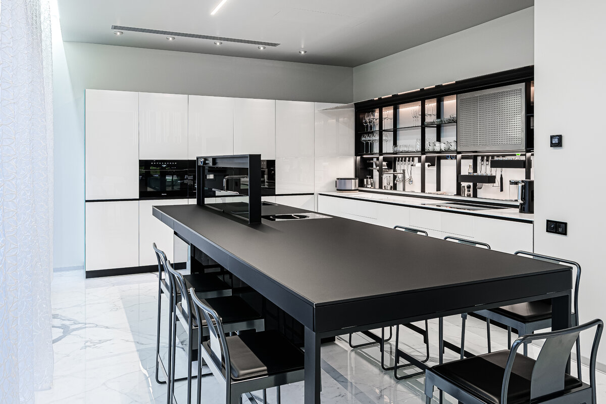 #ПродуктовыеЗаметки #кухни #дизайнинтерьера #система хранения Объединение кухни, гостиной и столовой - самое популярное решение при строительстве современных домов. Но что делать, если мы проектируем дом в стиле минимализм, и зона готовки с многочисленными аксессуарами, столовыми приборами, посудой, банками-склянками совершенно точно не вписывается в этот стиль? Можно выделить кухню в отдельное помещение, но есть и более изящное решение - выдвижные поверхности, которые скрывают визуальный шум рабочих зон в то время, когда те не используются. Двери можно сделать отдельным акцентным элементом декора или использовать систему скрытого монтажа под цвет стен или кухонной мебели. Здесь уже все зависит от дизайна вашего интерьера и вкусовых предпочтений. Конечно, скрытые продуманные до мелочей и рассчитанные на долгосрочную эксплуатацию механизмы стоят космических денег. В белой кухне от итальянского бренда Valcucine используется, например, их собственный механизм. А решение, которое примени