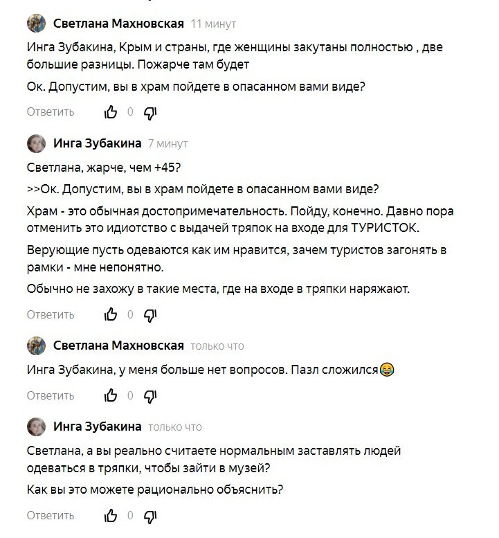 Никогда не понимала этого. У нас светское государство. Не религиозное. Почему я не могу зайти посмотреть летом в отпуске какую-нибудь красиво расписанную церковь в удобной одежде? Внутренние правила любой организации, как ни крути, стоят ниже законов государства. Соответственно, требования замотаться в тряпки на входе полностью незаконны. Соглашаясь соблюдать эти прихоти владельцев, мы позволяем унизить свои базовые права. Как можно гулять по улице, так должно быть можно зайти и в любое общественное место. Особенно если это место за счёт тебя, туриста, и существует. Описанный мной вид - это стандартная для любого человека летняя одежда: шорты и топ. Предлагаю таким организациям определиться: Иначе, на мой взгляд, это попытка усидеть на двух стульях: и заработать на туристах, и унизить женщин. А как вы к этому относитесь?