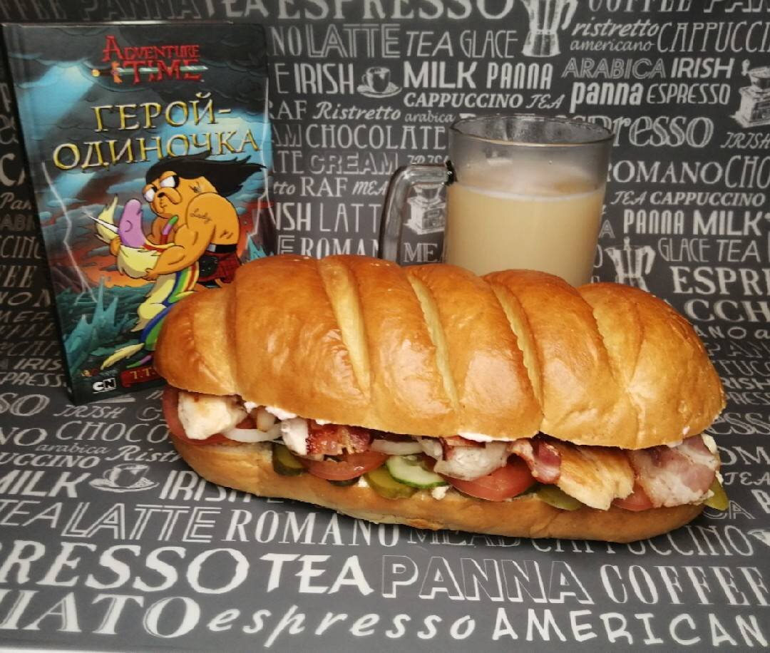 Привет, друзья. Сегодня будет самый огромный и грандиозный сэндвич из всех, что мы до этого делали. Я уже писал, что "Время приключений" занимает в нашей семье любимое и почётное место, поэтому возвращение к блюдам из этого мультика было лишь вопросом времени. Берите мечи, ножи, друга-пса и вперёд, готовить! "Я готов принять указания от креативного измерения для создания сэндвича, который я сейчас приготовлю. Я открыт. Снизойди на меня." ("Время приключений" - 5 сезон, 33 серия). #непп Ингредиенты: Батон, Творожного сыра, Крем-краба, Куриная грудка, Кольца салатного лука, Свежего укропа, Помидор, Маринованных огурцов, Огурца свежего, Майонеза, Бекона, Яйца, Соль, перец Способ приготовления: Батон разрезать горизонтально на 2 равные части. Половину куриной грудки отварить и разорвать руками на волокна, вторую часть птицы разрезать на две части и обжарить по 3 минуты с каждой стороны. Бекон обжарить. Яйца отварить. Огурцы, помидор, яйца нарезать кольцами. Лук разобрать на отдельные колеч