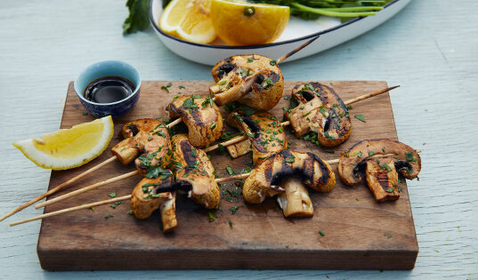 Петрушка для подачи (заказать все продукты для приготовления) Как приготовить: 1. Грибы промойте. Если грибы мелкие - оставьте целыми, если крупные - разрежьте вдоль на толстые слайсы. Замочите шпажки в холодной воде. 2. Смешайте бальзамический уксус, соевый соус, сахар, перец и измельченный чеснок, замаринуйте грибы на 20 минут. 3. Нанижите грибы на шпажки и обжаривайте на гриле по 2-3 минуты с каждой стороны. В процессе смажьте грибы с помощью кисточки оставшимся маринадом. 4. При подаче украсьте мелко нарезанной петрушкой. Понравился рецепт? Тогда подписывайтесь на наш канал! У нас всег