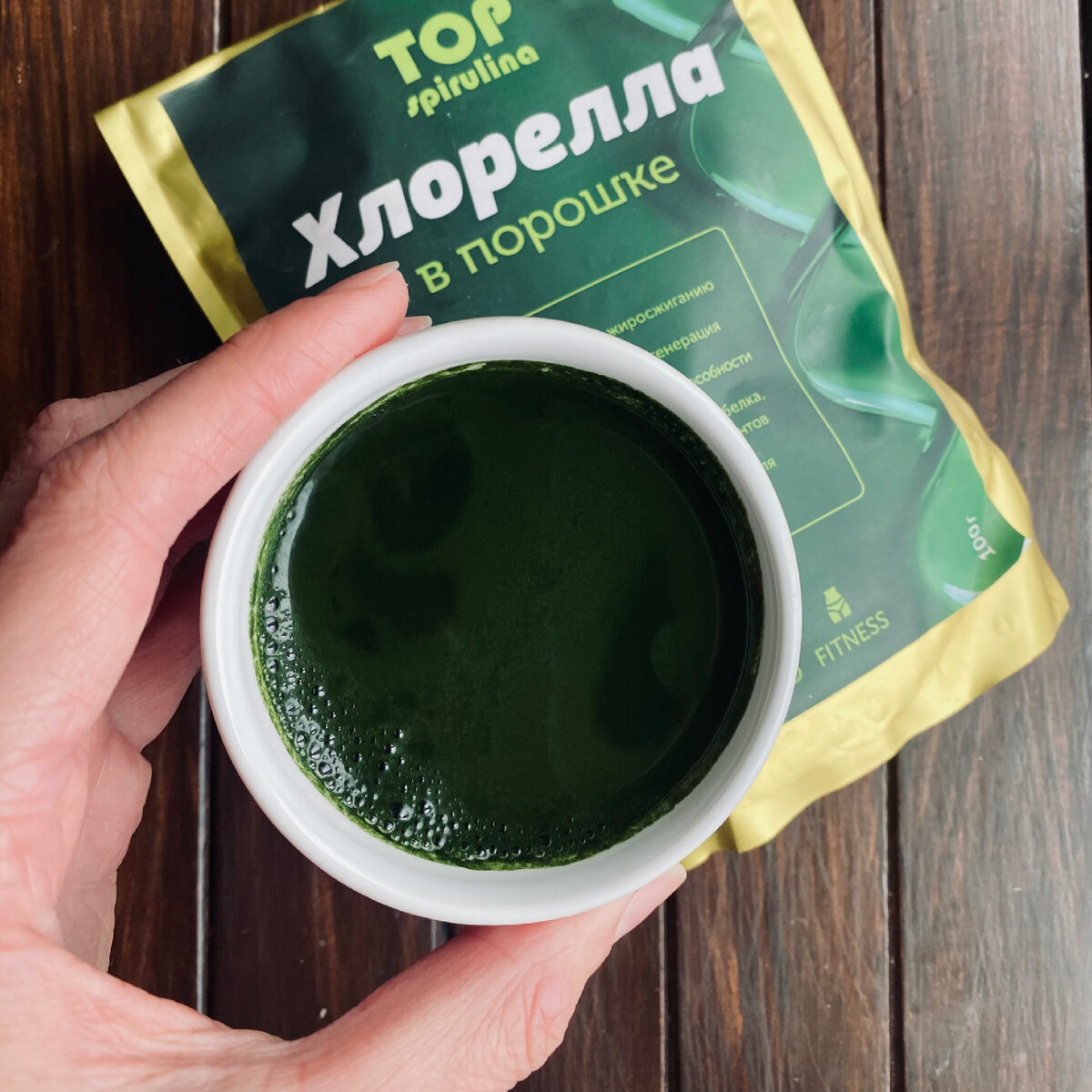 ХЛОРЕЛЛА С недавних пор я включила хлореллу в ежедневный рацион - примерно по 1 ч.л. на 30-50 мл воды с добавлением лимонного сока 1 раз в день во время завтрака (можно добавлять в смузи, но я не любитель последних). Эта водоросль обладает Мега-высокой питательной ценностью. Она считается чемпионом по количеству хлорофилла (способствует очищению крови от токсинов и шлаков). Хлорелла – близкая родственница знакомой многим спирулины, но питательные свойства этих двух водорослей отличаются, поэтому их сложно назвать взаимозаменяемыми. ! Является рекордсменом по содержанию белка и прекрасным источником железа, а благодаря витамину C в составе, помогает организму лучше усваивать этот элемент. 1 ст. л. (10 г) порошка хлореллы содержит: 50-70% белка!!!; 96% суточной дозы чистого витамина А; 67% железа; 90% витамина В2; 11% витамина В3; 44% цинка; 7% магния. В ее составе также присутствует каротин, калий, фосфор, медь, йод!!!, цинк, селен, полезные жиры, витамины С, В1, В6 и В12 (спорно).