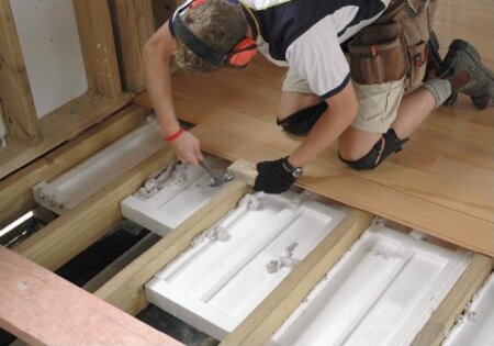 Для более качественного утепления в деревянном доме часто прибегают к системе двойных полов. Первым слоем в данном случае монтируют, так называемый черновой пол – необработанные доски, прикреплённые к балкам перекрытия, если речь идёт о втором этаже или же к лагам. Дерево само по себе обладает низкой теплопроводностью. Верхний слой – чистовой пол укладывают на нижний, иногда через лаги с дополнительным утеплением. Далее следует монтаж декоративного покрытия.
