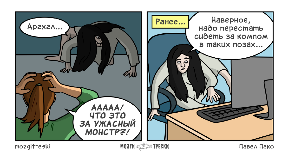 С недавних пор в моем блоге сложилась небольшая традиция начинать тематические подборки комиксами, которые я нарисовал лично, так что и в этот раз я не буду изменять данному правилу. Комикс, который вы можете видеть ниже, выходил в рамках моей серии Мозги трески - там, кстати, довольно часто выходят зарисовки, посвященные разным ужастикам.