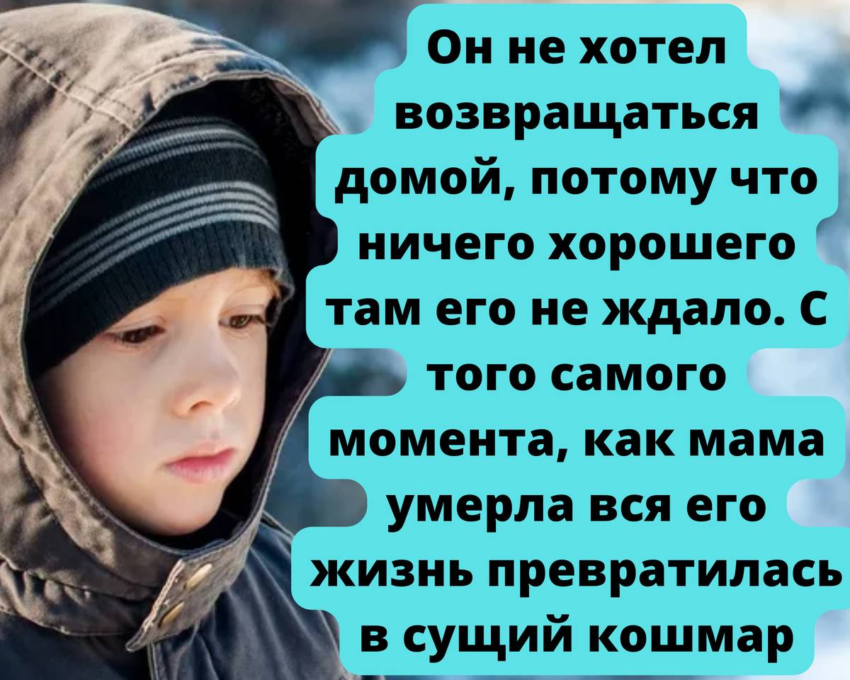 Мальчишка стоял возле подъезда. Он не хотел возвращаться домой, потому что ничего хорошего там его не ждало. С того самого момента, как мама умерла вся его жизнь превратилась в сущий кошмар, более того он прекрасно осознавал, что не нужен ни отцу, ни новой мачехи, а теперь когда мачеха еще и была беременной он мог знать что теперь абсолютно все заботы по дому свалится на его хрупкие мальчишеские плечи.
