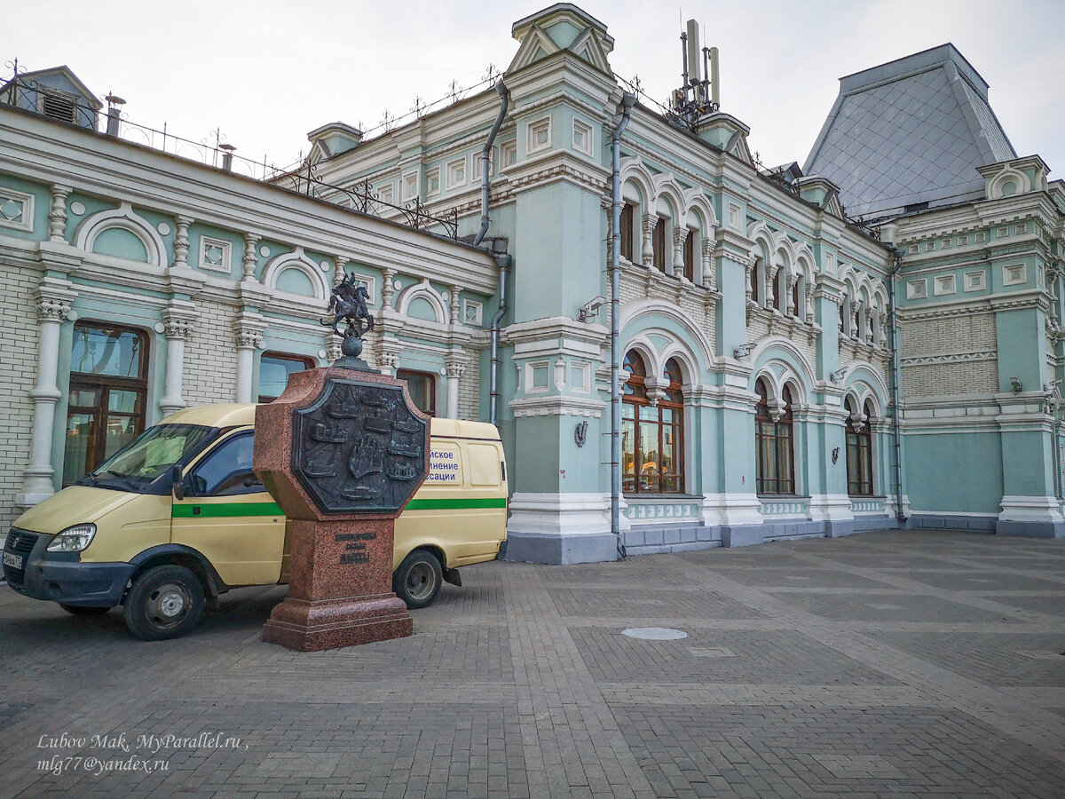 На площади перед Рижском вокзале стоит необычный памятник, который посвящен старым вокзалам Москвы. Больше ста лет в Москве было 9 вокзалов. Строили вокзалы на века, чтобы было красиво и удобно, отсюда и большие помещения вокзалов, великолепная архитектура с лепниной, красивыми люстрами, розетками, мрамором и позолотой. В 2014 году перед площадью Рижского вокзала появился памятник, посвященный девяти старинным вокзалам Москвы. На мраморном постаменте, на бронзовом основании в виде современной карты Москвы, изображены силуэты девяти московских вокзалов вокруг московского Кремля. На памятнике вокзалы подписаны, но не все силуэты угадываются. Автор памятника Щербаков Курский вокзал изобразил таким, каким он был до реконструкции до 1970 года, а Савеловский вокзал сделал более новым, после реконструкции в 90-х годах. Венчает памятник скульптура Георгия-победоносца на коне-символ герба Москвы. Внизу памятника бронзовыми сделана выбита надпись " Железнодорожные вокзалы Москвы". Памятник