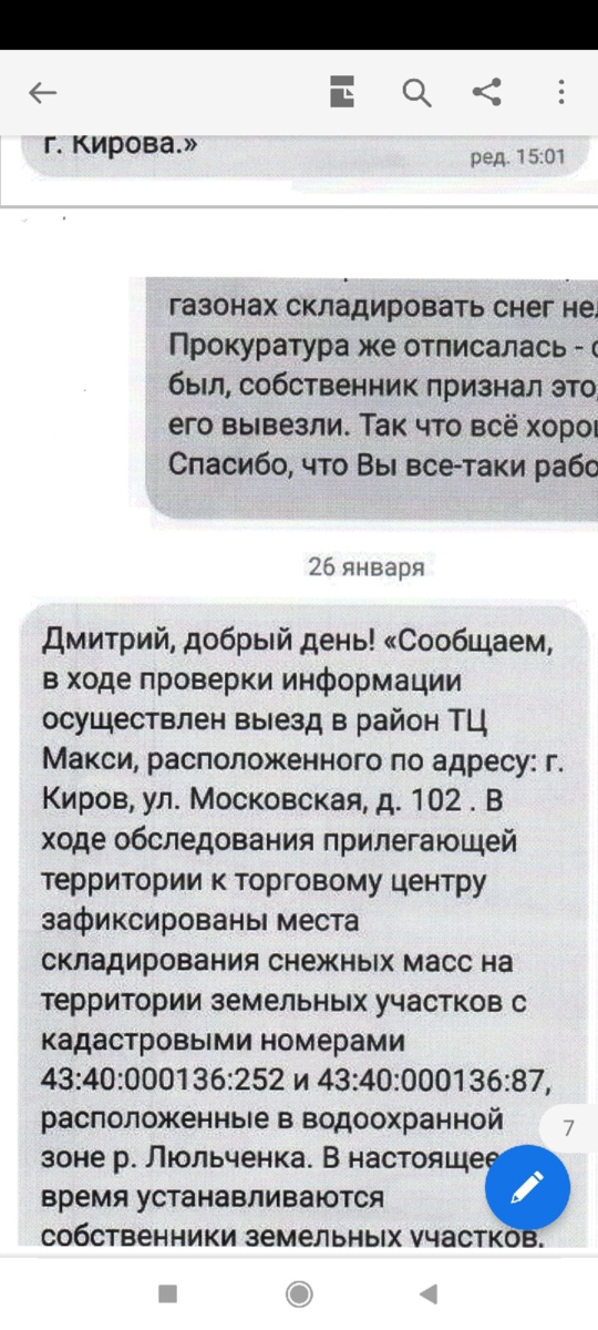 Публикуем переписку общественника с кировской природоохранной прокуратурой и Территориальным управлением по Ленинскому району г.Кирова по поводу загрязнения реки Люльченка в Кирове собственниками ТЦ "Макси", что на ул.Московская, 102 в Кирове.