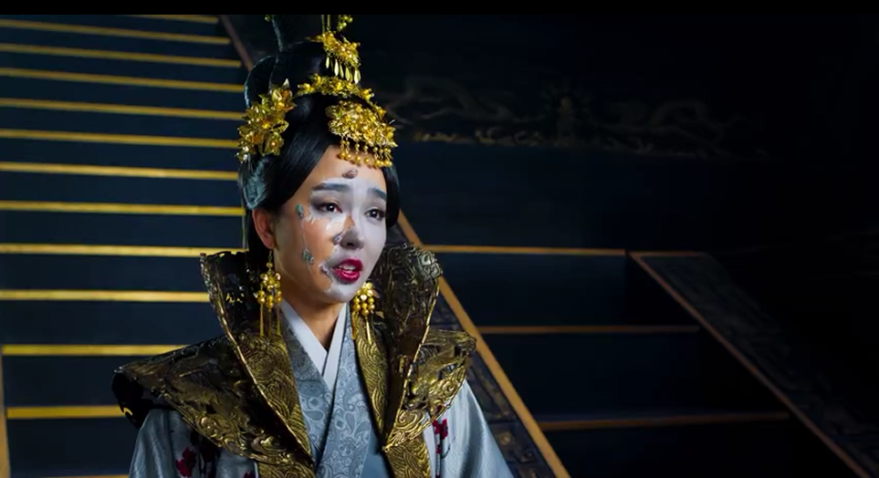 Но тут появляется Чен Лань верхом на драконе и ведьма падает с воздушного шара, рядом с ней в точно такой же одежде приземляется настоящая принцесса с печатью дракона на шее. Дальше дракон начинает по воздуху летать, драка приостанавливается а из корзины воздушного шара падает натуральный золотой дождь.