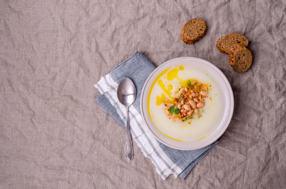 Прекрасным сытным первом блюдом считается фасолевый крем-суп. Его по достоинству оценят, как вегетарианцы, так и любители мяса. Супчик прекрасно насыщает, заряжает тело энергией на несколько часов. Готовится он дольно просто. Причем подойдет, как консервированная, так и обычная фасоль любого цвета! Последний вариант следует подготовить. Так фасоль замачивается холодной водой и выдерживается в течение 12 часов. После чего она доводится до готовности. Консервированная фасоль полностью готова к употреблению. Благодаря чему подвергать ее длительной термической обработке не следует. Стоит отметить пользу фасолевого крем-супа. Ведь фасоль богата ценными витаминами и минералами. Она содержит полноценный белок, который легко усваивается организмом. Благодаря чему фасоль считается альтернативой мясу. Ее принято включать в рацион спортсменов и людей, которые придерживаются строгих диет. Продукт незаменим для поддержания нормальной работы сердца и сосудов. В его составе много растительной клетчат