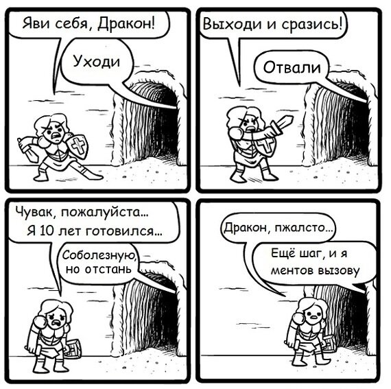 Привет, дорогой друг! Комиксы обладают удивительной способностью веселить и переносить читателей в другие миры, как и книги. Но в отличие от большинства книг, #комиксы вдобавок поражают воображение яркостью и красотой графики. Сегодня я решил сделать подборку, в которой отлично проявятся обе составляющие — #юмор и волшебный визуал. Естественно, лучше всего волшебный визуал становится виден в комиксах, посвященных волшебным мирам или магическим существам, например, драконам. Так что сегодня у нас есть возможность взглянуть на милую и забавную, а не пугающую драконью составляющую. В сказках, древних мифах и #фэнтези с драконами почти всегда сражается какой-нибудь принц. Mrlovenstein представил, что из-за этих стереотипов драконы могут стать заложниками определенного образа, который их вовсе не отражает. Обязательной составляющей любого уважающего себя мифа или легенды является сражение с драконом или, проще говоря, драка. Но Mayoking считает, что в любой ситуации лучше попробовать догово