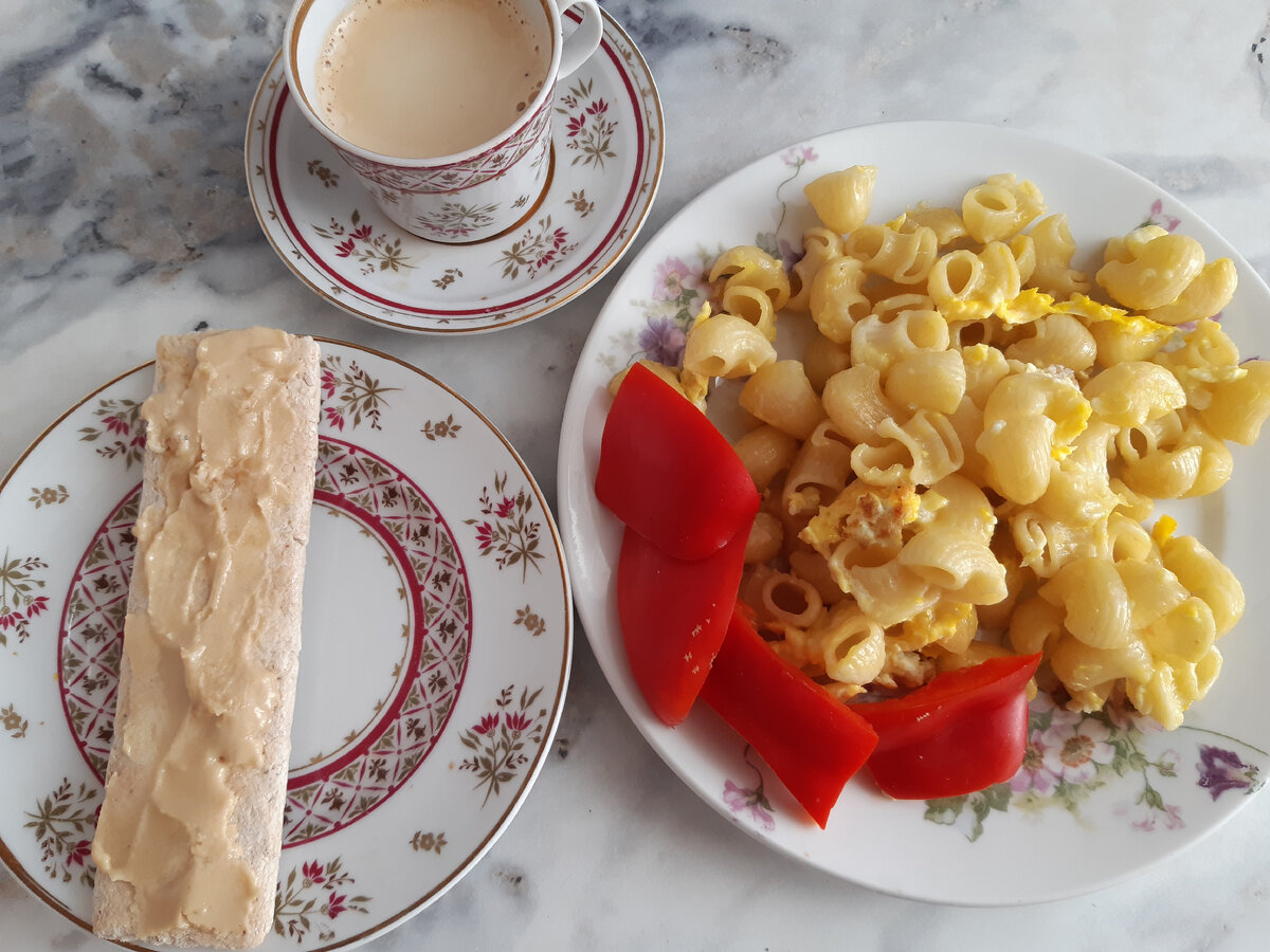 #завтрак сегодня у был почти готов. Вчера на ужин сварила двойную порцию макарон, утром только разогрела, перемешала с яйцами. Добавила овощи. Чашка кофе эспрессо, хлебец с арахисовой пастой и еще 2 квадратика шоколада Ritter Sport с марципаном