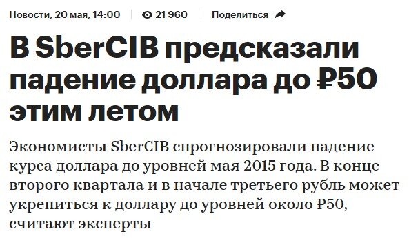 Свежий прогноз аналитиков SberCIB традиционно является очень оптимистичным для рубля. Экономисты полагают, что к концу второго - началу третьего квартала курс рубля вырастет до 50 рублей за доллар. Правда к концу года обратно упадет до 60-70. Этот прогноз был опубликован 20 мая. Примечательно, что днем ранее, 19 мая, аналитики того же SberCIB рассчитали среднегодовой курс рубля в 2022 году на уровне 73 рубля за доллар. Так или иначе, 20 мая курс доллара к рублю на Мосбирже уже опускался ниже 60 рублей за доллар, доходил до уровня 57,50, правда, потом снова вернулся выше 60. Движение все так же ступенчатое, то есть, администрируемое, формат "нарисованного курса" сохраняется. Помимо ряда важных валютных ограничений, которые продолжают действовать, на укрепление рубля влияют и другие факторы, в частности - сильное падение импорта и увеличение разрыва в торговом балансе между экспортом и импортом (подробнее описывал все факторы в большой статье Почему укрепляется рубль?). Ввиду невыгодност