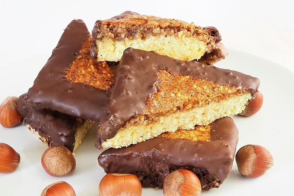 Суббота время выпечки, и сегодня — сладкие и ореховые (очень ореховые!) уголки, которые на вид — сложные, а на деле готовятся на раз-два. Реально, самое сложное в них — обмакнуть потом готовые пирожные в шоколад так, чтобы красиво получилось. Ну и потом — отогнать домашних, чтобы они не съели все за один присест. Нахвалил, Тогда берем: Для нижнего слоя Для верхнего слоя Дополнительно: Как готовим: Сначала готовим все «для верхнего слоя». Половину орехов — 200 гр, перемалываем в мелкую крошку, а половину — рубим покрупнее. Масло растапливаем, смешиваем с орехами, сахаром, ванилью или ванилином и, если масса получилась ну очень густая (распределить ее будет сложно), то добавляем по ложке воды, вымешивая — максимум 4 ложки. Все продукты из списка «для нижнего слоя» смешиваем в гладкое тесто, раскатываем на противне, застеленном кондитерской бумагой и смазываем абрикосовым джемом. Поверх джема распределяем второй, ореховый слой, и отправляем выпекаться при температуре 180-200 град