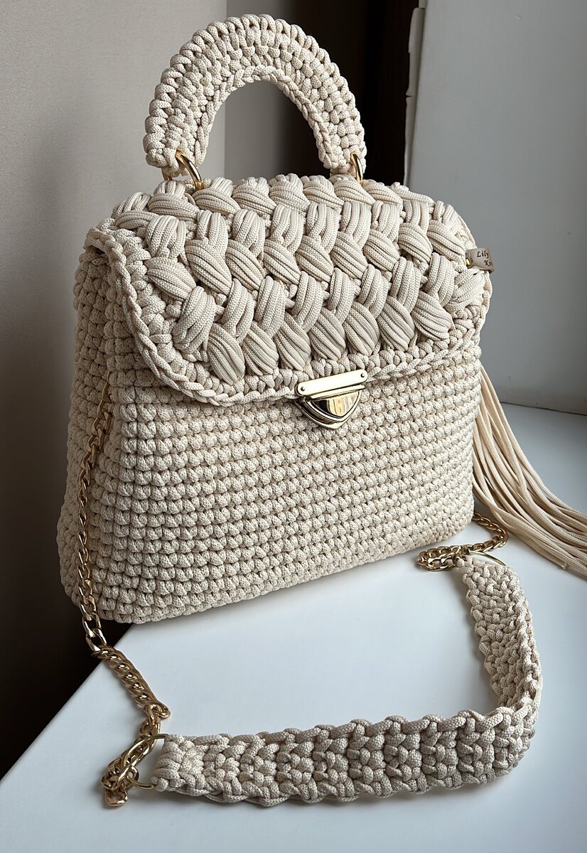 Да да, именно! С одним условием: что в вашем образе будет эффектная изюминка🔥 И я в свою очередь, конечно же, предлагаю классную вязаную сумку из полиэфирного шнура🔥 Делюсь кратким описанием, если у вас есть хоть какой-то опыт вязания крючком, я уверена, у вас все получится👍 Ну а если вы не вяжете, но непременно хотите себе такую сумку, то я с удовольствием для вас свяжу (в конце статьи оставлю свои контакты). Нам понадобится: 250-300 м полиэфирного шнура (я вязала из 5 мм), осн крючок 6 мм, доп крючок 4 мм. Из фурнитуры: портфельный замок, 2 полукольца, 3 карабина, 2 отреза цепи по 30-40 см, 4 средних разъёмных кольца (2,5 см). Дно: набираем 27 в.п. + 1 петля подъёма. Вяжем 4 круговых ряда (по краям делаем прибавки). На дно установила пукли (ножки). Также можно обвязать дно соединительными столбиками. Нить отрезаю, делаю имитирующую петлю (на днях выйдет видео про эту петлю, не пропустите). Дно укрепляю с помощью пластиковой канвы (пришиваю мононитью - тонкой леской). Стенки вяжу