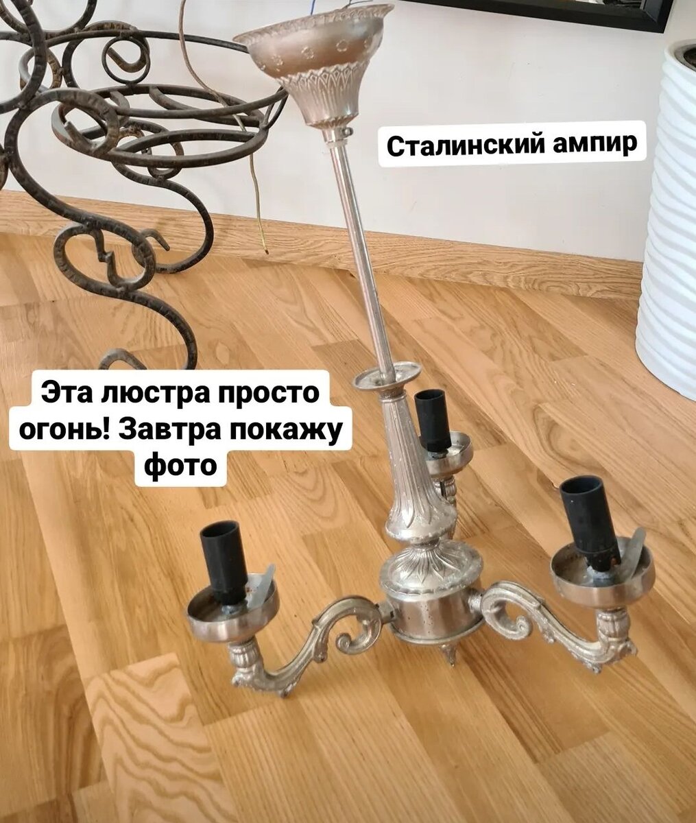 Моё увлечение винтажом стало набирать обороты, и вот уже каждый вечер перед сном я листала авито в поисках сокровищ. В один из вечеров я нашла её - сразу поняла, что вещь уникальная, редкая и хорошо сохранилась. И, что уж там, очень мне понравилась! Вот так выглядела люстра, когда мы ее только привезли домой: За ней мы специально ездили в Таганрог. Это уже наша традиция - ездить за люстрами в Таганрог 😁 Перед тем, как ее привесить, мы поехали за лампочками. Поскольку у люстры не сохранились плафоны, а искать подходящие я не планировала, было принято решение подобрать крупные лампочки. В рожкАх есть отверстия - вероятно, в своей оригинальной версии люстра имела хрустальные подвески, которые тоже не сохранились. Но и бех них она прекрасна, я считаю:) Люстра заняла свое место на потолке у меня в мастерской. Она радует взор и поднимает настроение всякий раз, когда ее вижу. Она с духом старины, но прекрасно вписывается и в современную жизнь! Для удобства Сережа предложил заменить мелкие