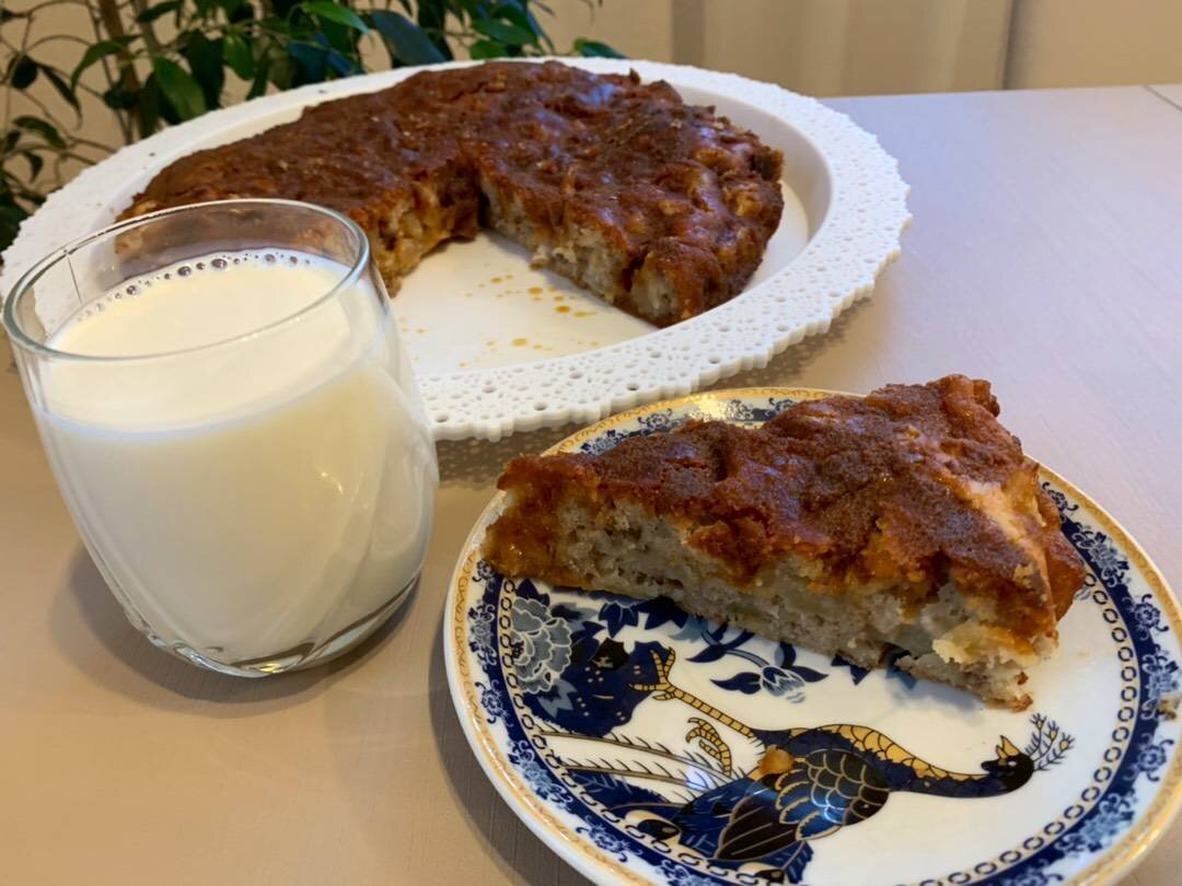 Один из самых любимых пирогов нашей семьи, ароматный, карамельный, божественный вкус и очень легкий в приготовлении. Если вы любите больше теста меньше яблок, то рекомендую удвоить ингредиенты для теста. Ингредиенты: Для теста:, Мука , Яйцо, Масло растительное, Орехи грецкие или пекан , Ванильный сахар , Разрыхлитель , Соль , Яблоки , Глазурь:, сахара, сливочного масла, Сливки 10% Способ приготовления: Тесто: Яйца взбиваем с сахаром, когда масса увеличится и посветлеет, добавляем растительное масло и тщательно, но аккуратно перемешиваем. Добавляем в тесто просеянную муку и разрыхлитель, соль, ванилин, орехи и яблоки. Все аккуратно сверху вниз перемешиваем лопаточкой. Получается достаточно густая смесь. Яблоки очистить от кожуры, нарезать крупными кусочками, орехи размельчить на кусочки (скалкой или молотком для мяса) поджарить немного на сухой сковородке. Разъемную форму (у меня 24 см) выстилаем пергаментной бумагой и выкладываем в нее тесто. Разравниваем. Выпекаем пирог 30 минут при 1