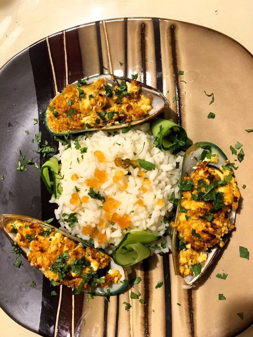#пп #морепродукты #мидии #духовка #ужин #простовкусно #ресторандома #удивитьгостей #начинающим Простое в исполнении и эффектное блюдо, способное удивить ваших гостей. Не требует предварительной разморозки. Ингредиенты: замороженные новозеландские мидии на створке, сыра, азиатского острого соуса, например-сладкий чили или шрирача, Рис, воды, Подача, Слайсы свежего огурца, Зелень, По желанию и возможности - любая икра Способ приготовления: Вынуть замороженные мидии из морозилки. Не размораживать. Натереть сыр, смешать его с шрирачей и выложить на мидии. Параллельно отварить рис для гарнира. Поставить мидии в духовку, разогретую до 180 градусов на 7-8 минут. Выложить в центр тарелки рис, по краям мидии, положить полоски огурца, нарезанные овощечисткой, свернутые рулетом. Посыпать нарезанным зелёным луком.