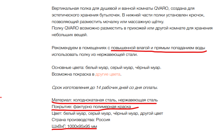 Частенько недобросовестные предприниматели пытаются сыграть на непросвещенности клиентов, выставляя слабые стороны своего товара, как что-то очень качественное. Мы - компания SWOG. Занимаемся обработкой металлов и покраской материалов. Для создания нашей продукции используем: холоднокатаную сталь, горячекатаную сталь, нержавеющую сталь. Знаем все этапы производства “от А до Я”. Так что мы, как никто, можем говорить о качестве! Карточка товара или указанные характеристики - первое, на что стоит обратить внимание при выборе мебели. Давайте же разберемся на примере описания нашей вертикальной полки Qvaro, как пример правильного и надежного описания товара: Красным подчеркнуты все важные характеристики товара. Сразу указаны размеры, материал и покрытие. Важно то, что полка выполнена прежде всего из нержавеющей стали, а значит прослужит верой и правдой хозяину во влажных условиях ванной комнаты с прямым попаданием воды. А фактурно полимерная краска имитирует различные покрытия, которые хоро