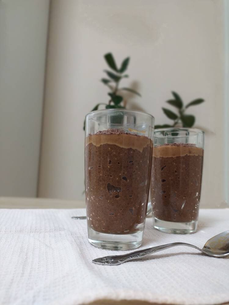 #веган #десерт #десерты #чиа #арахис. Десерт без яиц, молочных продуктов, глютена (если растительное молоко без глютена), без сахара (если без покупного шоколада). Ингредиенты: Для нижнего слоя:, растительное молоко (любое), ст.л (ок. 70 г) семена чиа, ст.л какао-порошок или кэроб, ст.л сироп финиковый/агавы/топинамбура/мёд, соли, Для верхнего слоя:, растительное молоко (любое), финики (маленькие. В очищенном виде 40 г), ст.л (25 г) арахисовая паста (желательно без добавок), ст.л сироп финиковый/агавы/топинамбура/мёд, соли, Для украшения (по желанию):, арахис (обжаренный без соли), горький шоколад Способ приготовления: Смешать растительное молоко с подсластителем до его растворения. *На заметку: Для этого можно подогреть небольшое количество молока (до тёплого состояния), растворить в нём подсластитель и вылить к этой массе оставшееся молоко. Но это правило скорее актуально для густого мёда. Я использовала финиковый сироп, он отлично перемешался с молоком, не нагревая. В полученное сла