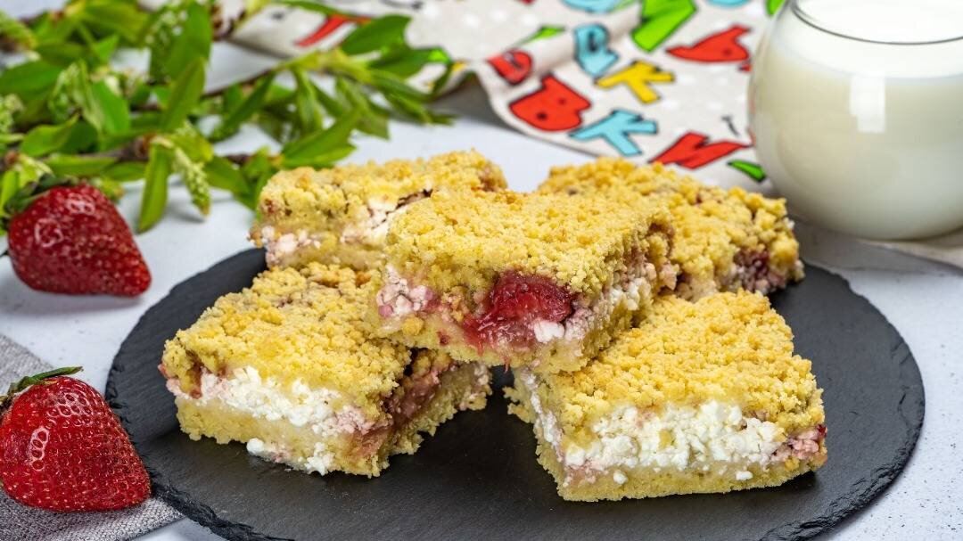 Отличный рецепт быстрого приготовления пирога из песочного теста с творогом и свежей клубникой, который приятно удивит своими великолепными вкусовыми качествами! Ингредиенты: Пшеничная мука , Сахар , Маргарин , Пищевая сода , Лимонный сок , Сливочное масло , Куриные яйца, Ванильный сахар , Клубника , Творог , Соль Способ приготовления: Для приготовления песочного теста выкладываем в большую миску 350 граммов предварительно просеянной пшеничной муки высшего сорта, добавляем в нее 120 граммов сахара, 0,10 чайной ложки соли и перемешиваем все ингредиенты. Выкладываем в миску с мукой 180 граммов нарезанного кусочками и размягченного маргарина для выпечки, который можно заменить на сливочное масло и перемешиваем все ингредиенты. Высыпаем в небольшую миску 1 чайную ложку пищевой соды и гасим ее 1 столовой ложкой лимонной кислоты. Погашенную пищевую соду добавляем в общую миску и вновь перемешиваем между собой все ингредиенты, после чего продолжаем перетирать тесто руками до крошки необходимо