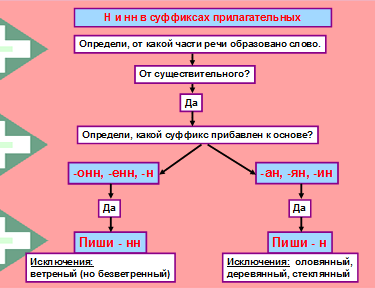 Алгоритм написания Н, НН в суффиксах прилагательных
