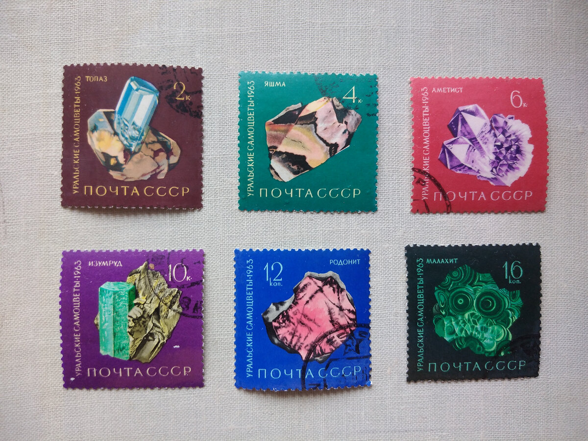1963 год. Декабрь. Уральские самоцветы. Рисунки Н. Круглова. Офсет на мелованной бумаге с лаковым покрытием. 2 коп. - Топаз - многоцветная, на карвиново- коричневом фоне. 4 коп. - Яшма - многоцветная, на сине-зеленом фоне. 6 коп. - Аметист - фиолетовая, красно-карминовая. 10 коп. - Изумруд - ярко-зеленая, светло-оливковая, на темно-фиолетовом фоне. 12 коп. - Родонит - многоцветная, на темно-синем фоне. 16 коп. - Малахит - сине-зеленая, голубая на черном фоне. Во многих городах Урала созданы минералогическо-краеведческие музеи. Действует Режевской государственный природно-минералогический заказник " Самоцветная полоса Урала". Существует несколько признаков, по которым классифицируют все камни. Чаще используют систему Клюге и Бауэра. Немецкий ученый -минералог Клюге составил список, состоящий из 5 групп минералов.Три включают драгоценные образцы (алмазы,топазы,опалы,гранаты,турмалины), а две отведены для простых самоцветов. Н а Урале находят самоцветы всех порядков , от драгоценных