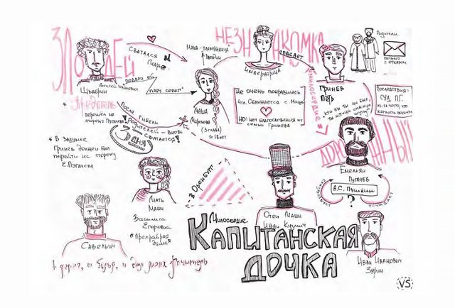 Это могут быть информационные блоки, маркированные списки, имена и факты. Здесь важно ориентироваться на личные ощущения — что лучше отразить в тексте, а что — в картинке. Если трудно прописывать, нарисуй. Не получается нарисовать — напиши. Так всё время происходит игра с информацией, складывается образная канва, её обогащает ваш личный подход.
