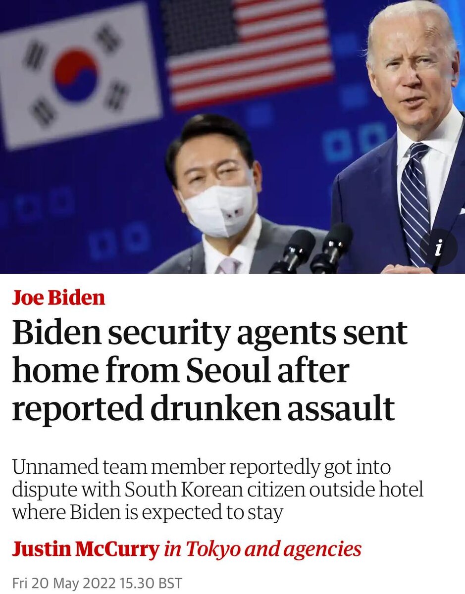 Бодрого утра! Двух охранников Байдена выслали из Сеула за то, что сильно напились и избили местного жителя. Это произошло «во внеслужебное время» в ходе азиатского турне главы Белого дома, который прибыл с визитом в Южную Корею 20 мая. Как уточняет Reuters, один из членов группы безопасности американского президента был арестован ещё за день до прибытия Байдена в Сеул. Однако Секретная служба США в пятницу подтвердила, что в «административный отпуск» после «инцидента» были отправлены двое её сотрудников. Америка явно переживает период своего вырождения. Кого там вообще набирают в охранники президента? Даже охранники Тимати такого себе никогда не позволяли. Какая-то комедия. Старый коррупционер и в охранниках у него животные. Поддержка друга важна Новые похождения беженцев в Европе. В Британии охранник приютил у себя 22-летнюю украинскую беженку из Львова и спустя 10 дней бросил жену, с которой прожил десять лет и имел двоих детей. А жена симпатичная. Видимо у неё просто нет таког