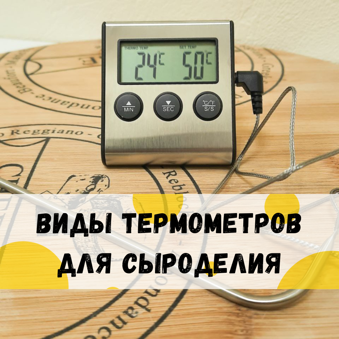 Термометр - вещь в сыроделии незаменимая. С его помощью мы контролируем каждый этап производства сыра: Отклонения от рекомендованной t°С могут пагубно повлиять на сыр. Поэтому выбирать термометр нужно как можно более точный и удобный в использовании. Давайте рассмотрим, какие бывают термометры. Виды термометров Механический термометр со стрелкой Этот металлический водонепроницаемый аппарат с длинным щупом всем хорош. Но он медленно реагирует на изменения температуры, а это значит, есть риск перегреть молоко. Электронный термометр со щупом Определяет температуру быстро и точно. Видеть цифры на экране такого термометра намного удобнее, чем считывать информацию по шкале со стрелками. Но если выбирать такой прибор, обязательно нужно проверить, есть ли у него крепление. Иначе придется все время держать его в руках. А это неудобно. Электронный термометр с погружным зондом Компактный и удобный: погрузил зонд в молоко, поставил термометр на столе рядом и спокойно наблюдаешь, как меняют