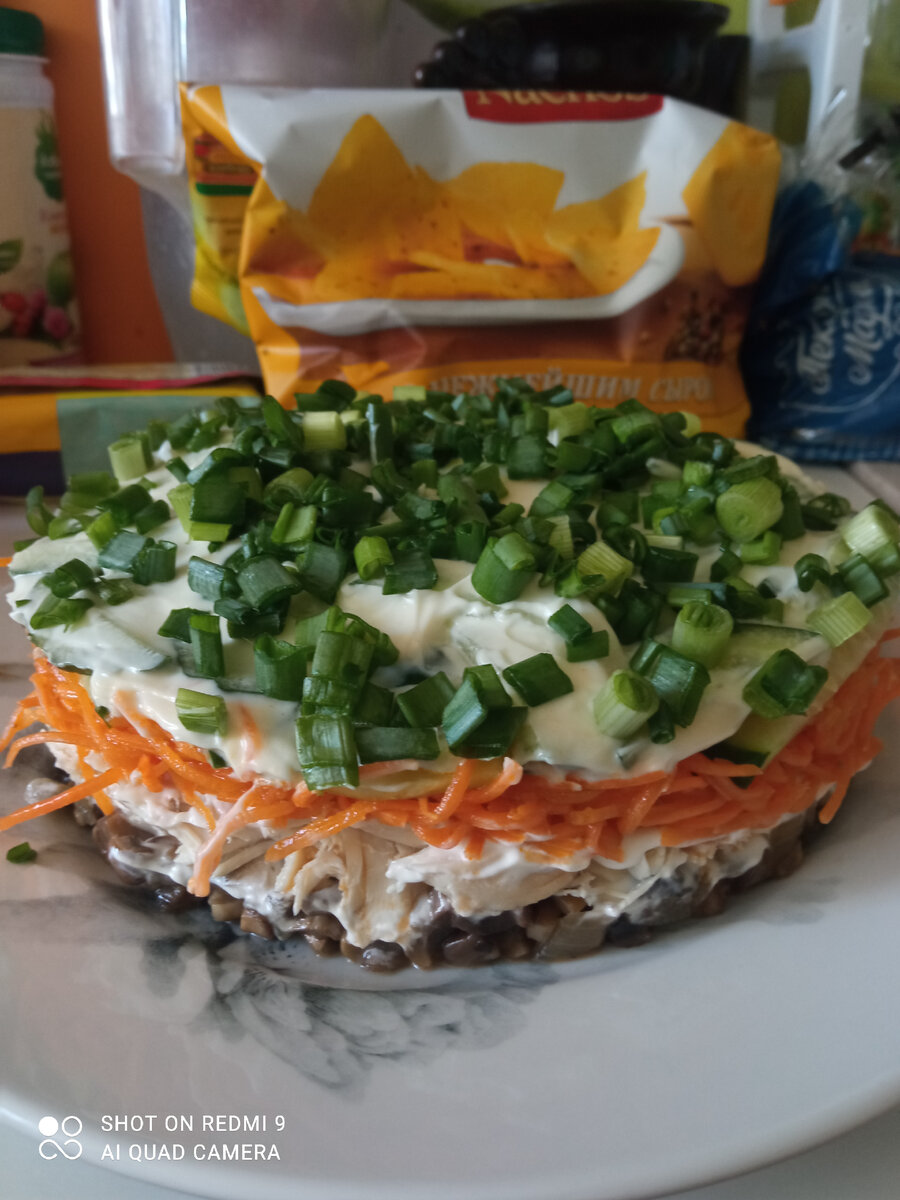 Вот с таким названием я увидела салат. И, конечно же, мне захотелось его приготовить. Ингредиенты не сложные, попробуем. Все подготовила, грибы, грудку, даже майонез сделала. Не очень люблю укладывать салаты слоями, но тут и это решила сделать. Все собрала, на тарелке смотрится симпатично и яркий цвет есть. Зелёный лук мое введение, чтобы украсить как-то. Свежие огурцы дают свежесть. Муж сказал:"вкусно". Я могу сказать так неплохо, но гастрономического оргазма я не получила. Так что в целом неплохой салат, но не супер.