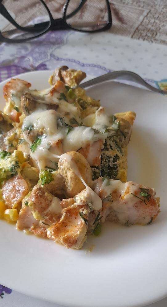 Если вы следите за тем, чтобы ужин не перегружал желудок и был максимально полезен и ,в то же время , вкусным, то этот рецепт, я думаю, вам подойдёт. Ингредиенты: куриного филе, шампиньонов, замороженные или свежие овощи по вашему предпочтению, соль и специи , яйца, зелень , сыра, сметаны Способ приготовления: Филе промыть, обсушить и порезать на небольшие порционные кусочки. Шампиньоны помыть и порезать на четвертинки если они не крупные. (лучше, если грибы обжарены). Добавить их к мясу, посолить и добавить любимые специи. Всё перемешать. В форму для запекания высыпать овощи(у меня замороженные), посолить. На овощи выложить мясо с грибами. Для заливки смешать сметану и яйцо. Залить продукты в форме. Накрыть форму фольгой и отправить в разогретую духовку до 180° на 40 минут. Через 40 минут снять фольгу, посыпать всё рубленой зеленью и сыром. Запекать ещё 5 минут.
