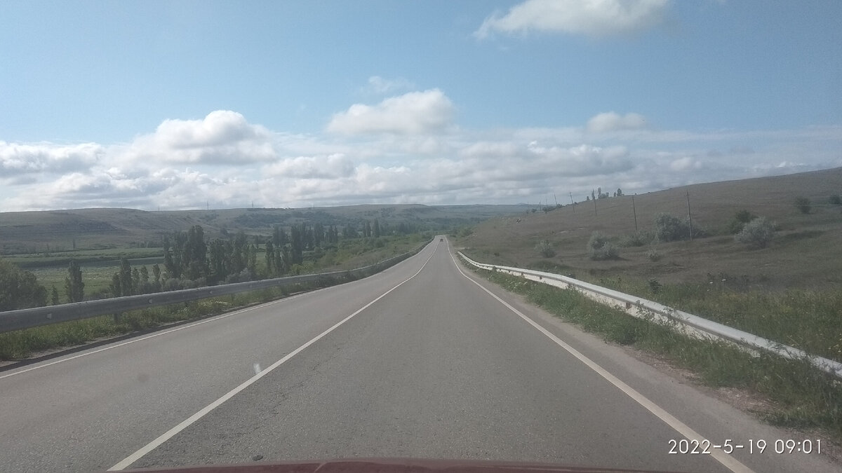 Но сначала то, что было раньше: вообще то сразу мы заехали на Белую скалу. Мимо едем - надо глянуть. Там всегда прекрасно, хоть зимой, хоть в летний зной. Нравится нам там и всё тут. Часть первая тут: А пока простор и красота, хорошая дорога, пьянящий воздух. Проезжая село Майское всегда покупаем обжигающие, с тандыра лепёшки. От хлебного духа срабатывает рефлекс и начинает выделяться желудочный сок))) одну съедаем сразу, никакая ресторанная еда не сравнится с горячей настоящей тандырной лепёшкой. К самой Белой скале мы не поехали, нам больше нравится долина у Дисковидного грота. Расписывать наши восторги не стану. Настроение и самочувствие были как небо на фото. Насмотревшись, и надышавшись пошли к гроту. Сверху капал такой мини-водопадик, в самом гроте в чашу громко капала вода. При наших прошлых посещениях такого не было и мы полезли наверх, глянуть на оживший ручей, русло которого раньше конечно видели. На фото всё выглядит вполне себе не страшно, но когда Ипкинс хотел подойти к