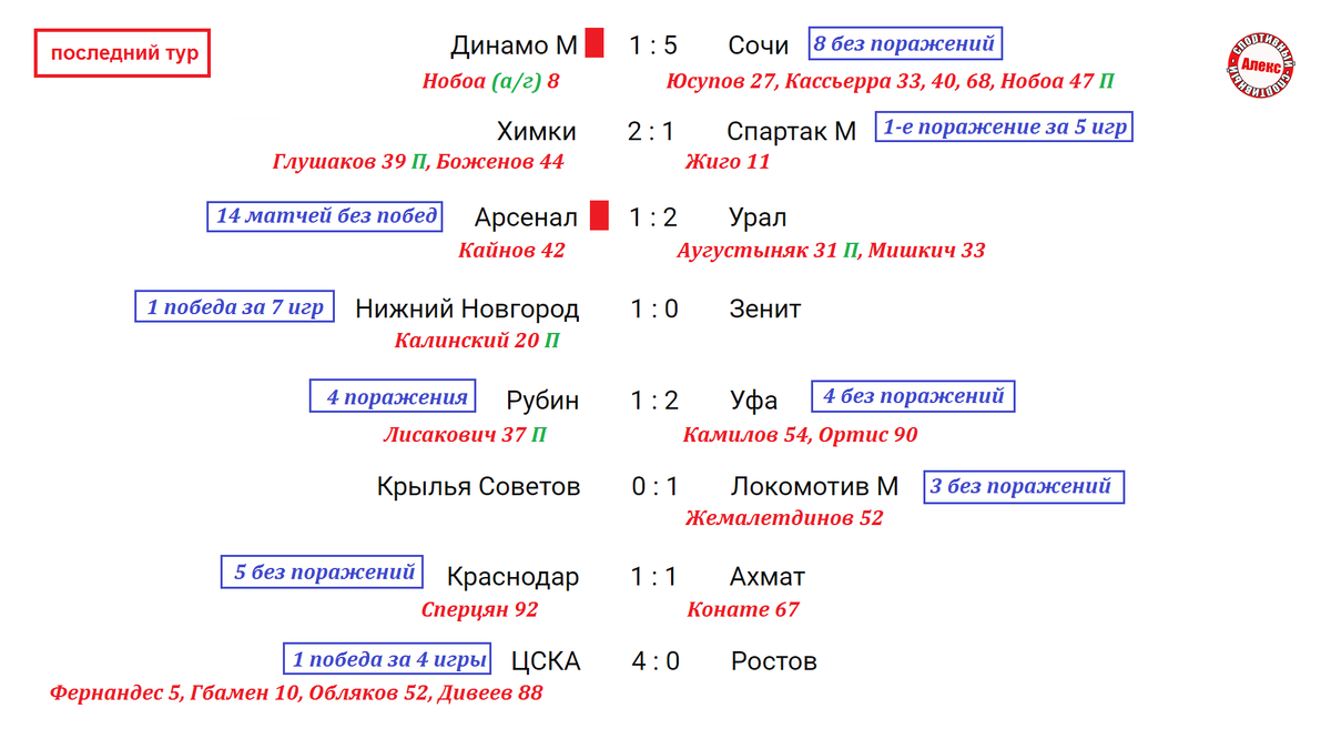 - ПФК Сочи разгромил на выезде Динамо 5:1. Очень жаль, что команда Федотова не сможет себя проявить в еврокубках. Сочи заканчивает сезон с 8-матчевой беспроигрышной серией (5 побед и 3 ничьи).