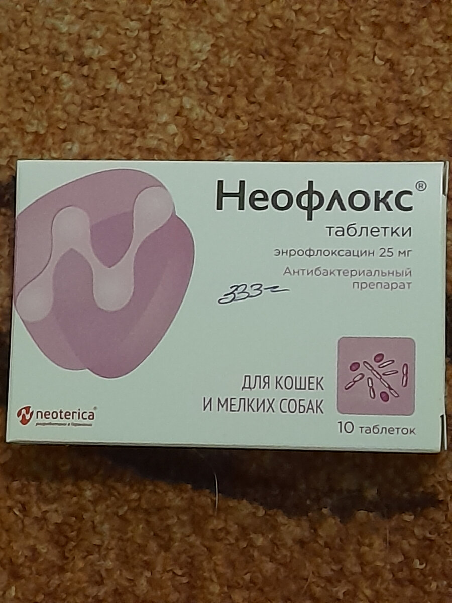 Не могу не написать про этот антибиотик. Потому как он меня просто выручил. Статья не заказная, а просто от души. Если прочитает производитель или дистрибьютер - от гонорара не откажусь)) Шучу, разумеется. Рад приветствовать вас на канале не волонтера, а обыкновенного любителя кошек. Как говорит Женя, Неофлокс, это тот же Байтрил. Не изучал этот вопрос, просто верю ей на слово. 10 таблеток по 25 мг, при респираторных заболеваниях дается раз в сутки. По цене выходит одинаково, что Байтрил колоть курсом, что Неофлокс давать. Только вот таблетки давать гораздо удобнее, на мой взгляд. Я писал в последней статье, что мои зверики пошли на поправку. Ну, как это обычно с кошками и бывает, я - сглазил. Персик. Он последний из тяжелых. Все остальные - вроде здоровы уже, хотя у меня есть подозрения, что инфекция готовится зайти на второй круг. Но Персик... Десять дней я давал ему Амоксиклав. У него был отказ от еды, я кормил его со шприца. И вроде бы он начал есть сам, где-то на пятый день, вроде