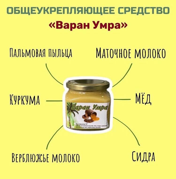 Варан Умра Варан Умра ПРИМЕНЕНИЕ: Бесплодие у мужчин и женщин: Принимать по чайной ложке утром вечером и ночью 3 раза в день за 40 мин до еды, так же принимать куст аль хинди. Диета исключает: сахар, дрожжи, газировку, консерванты, соль, соления, молочное. ДЛЯ ПАМЯТИ: Принимать по чайной ложке утром и вечером и перед сном, запивать водой. ПЕЧЕНЬ И ПОЧКИ: Принимать 2 раза в день - обедом и вечером за пол часа до еды запивая водой. Исключить газировку, консерванты, соль, сладкое полностью, так же кыст-альхинди с мёдом размешать и пить. ПАНИЧЕСКИЕ АТАКИ-СТРЕСС: Принимать 2 раза в день утром и вечером за 40 мин до еды запивая водой. Диета- сахар, соль, газировку исключить. Курс 3 банки. ВАРАН УМРА ДЛЯ СУСТАВОВ И ПЕЧЕНИ: Принимать 3 раза в день утром, вечером и ночью по чайной ложке запивая водой. Диета-исключить сахар, дрожи, газировку, консерванты, жирное и жаренное. БОЛЕЗНИ СЕРДЦА: Принимать утром и вечером по чайной ложке запивая водой. Исключить жирное,