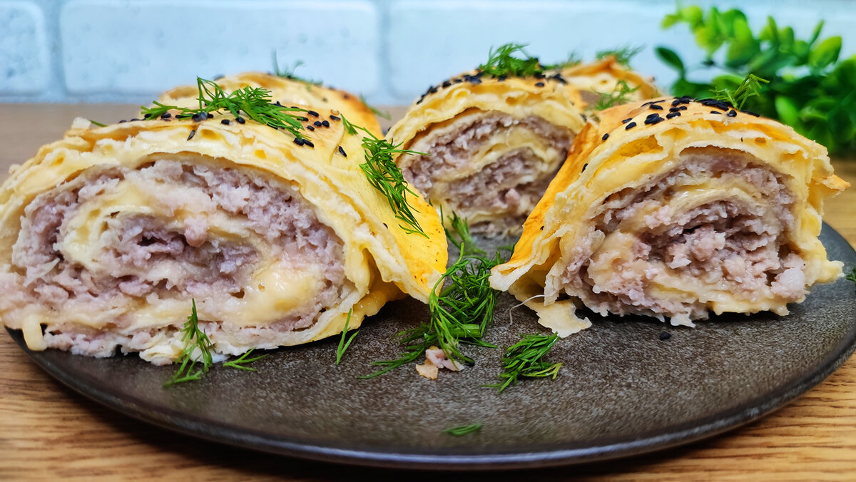 Приветствую вас на канале "Карамелька"! Готовлю потрясающе вкусный рулет из очень простых и доступных продуктов, без жарки и лишнего жира. Этот простейший "экспресс" рецепт часто меня выручает, когда нужно вкусно и быстро накормить семью или гостей, уверена, что и вам он тоже понравится. Особенно этот способ приготовления порадует кулинаров, которые не любят возиться с тестом. От такой вкусняшки мало кто откажется! Ну что давайте уже приступим к приготовлению! 📌Для приготовления нам понадобятся следующие продукты: В фарш (я использую свиной, но подойдет абсолютно любой) добавляем измельченный лук, соль и специи по вкусу. Фарш хорошо перемешиваем и убираем в сторону. Натираем твердый сыр на крупной терке и яйцо взбиваем в отдельную миску. Для приготовления нам понадобится тонкий лаваш. Лист лаваша хорошо смазываем взбитым яйцом и посыпаем сыром. Поверх лаваша с сыром укладываем еще один лаваш и наносим на него слой подготовленного фарша и оба этих лаваша сворачиваем в достаточно