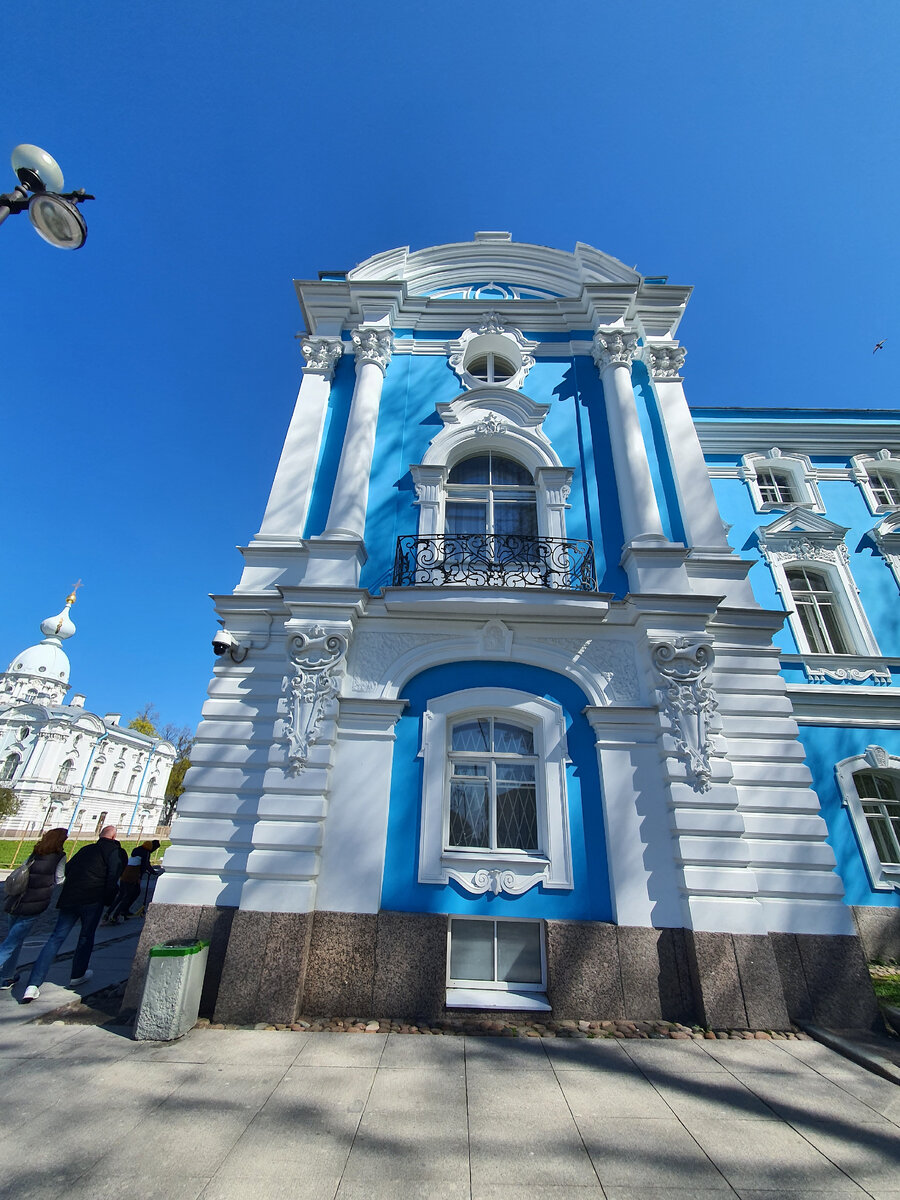 На днях возле Смольного распустились тюльпаны. Четыре огромные клумб, усеянные тюльпанами разных цветов радуют Петербуржцев. Прежде чем смотреть цветение, предлагаю немного пройтись вокруг. Кстати, в конце статьи я еще оставлю ссылку на видео из нашей прогулки. На самой территории Смольного собора сейчас ведутся какие-то ремонтные работы. Конечно, общий вид это слегка портит, но, надеюсь, что скоро всё закончат. Гулять в этой части города всегда приятно. Парки здесь чистые и ухоженные, а людей практически не встречается. Даже машины здесь проезжают редко. Так что если вдруг хотите собраться с мыслями и погулять в тишине, то Смольный сад станет отличным местом. На мой взгляд, Александро-Невская нуждается в реставрации. Местами нет штукатурки, виднеются красные кирпичи. Очень нравится мне этот небесно-голубой цвет зданий. Очень непохоже на остальной Петербург. А купола Смольного собора можно увидеть из разных точек Петербурга. В начале мы прогулялись до здания богадельни в память соверше