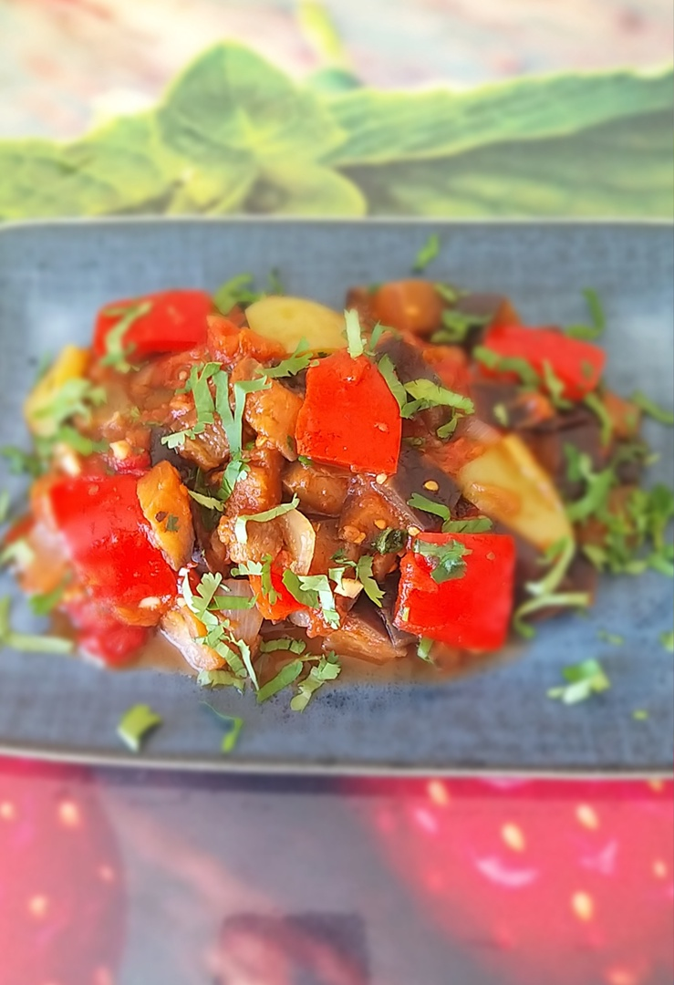 Баклажаны режем крупным кубиком,солим и заливаем водой,оставляем на 20 минут,для того,что-бы ушла горечь.Остальные овощи так же режем крупным кубиком.Обжариваем овощи,добавляем специи,томаты в собственном соку и тушим 20 минут.Кинзу и чеснок режем и добавляем в тушёные овощи после того,как они остынут.Готово!Приятного аппетита!Если вас заинтересовала статья, подписывайтесь на канал. Дальше будет интереснее.