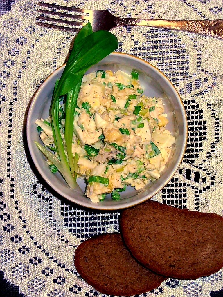 смешать все составляющие, посолить, поперчить и заправить майонезом.