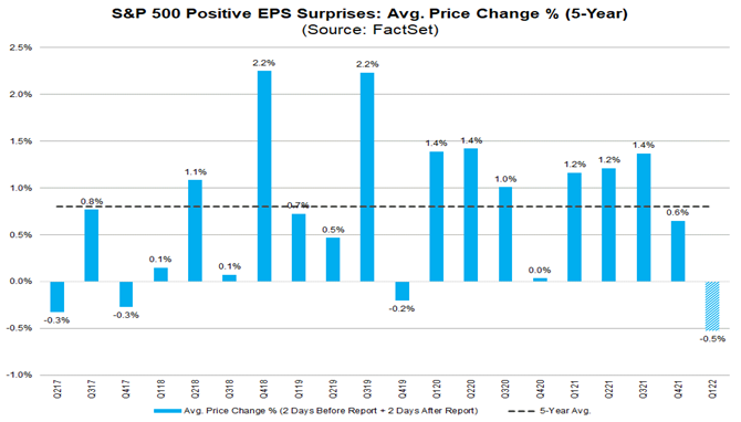 Компании, сообщившие о неожиданной положительной прибыли за 1-й кв. 2022г, столкнулись со снижением средней цены на 0,5% за 2 дня до публикации отчёта и через 2 дня после публикации. Это процентное снижение значительно ниже среднего за 5 лет роста цен акций на 0,8% в течение того же периода для компаний, сообщающих о неожиданных положительных доходах. Если это окончательный процент за квартал, то это будет самая большая средняя негативная реакция цен на положительные сюрпризы EPS, о которых сообщают компании S&P 500 за квартал