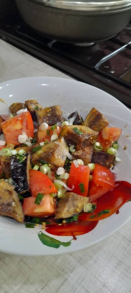 Этот салат любят все мои подруги. Рекомендую, девушки, попробуйте, если ещё не пробовали. Ингредиенты: баклажан (небольшой), крупный помидор, Зелень , мёда, горчицы в зёрнах (дижонская), сока лимона, соевого соуса, растительного масла, крахмала, чеснока Способ приготовления: Баклажан порезать на крупные порционные куски. Каждый кусок обвалять в крахмале. Обжарить баклажан на растительном масле до золотистого цвета и выложить на бумажную салфетку. Помидор порезать крупно. Зелень и чеснок порубить мелко, все соединить в салатнице. Добавить баклажан к помидору. Заправка: растворить мёд в соке лимона добавить горчицу, соевый соус, 2 ст.л. растительного масла. Полить салат и перемешать.