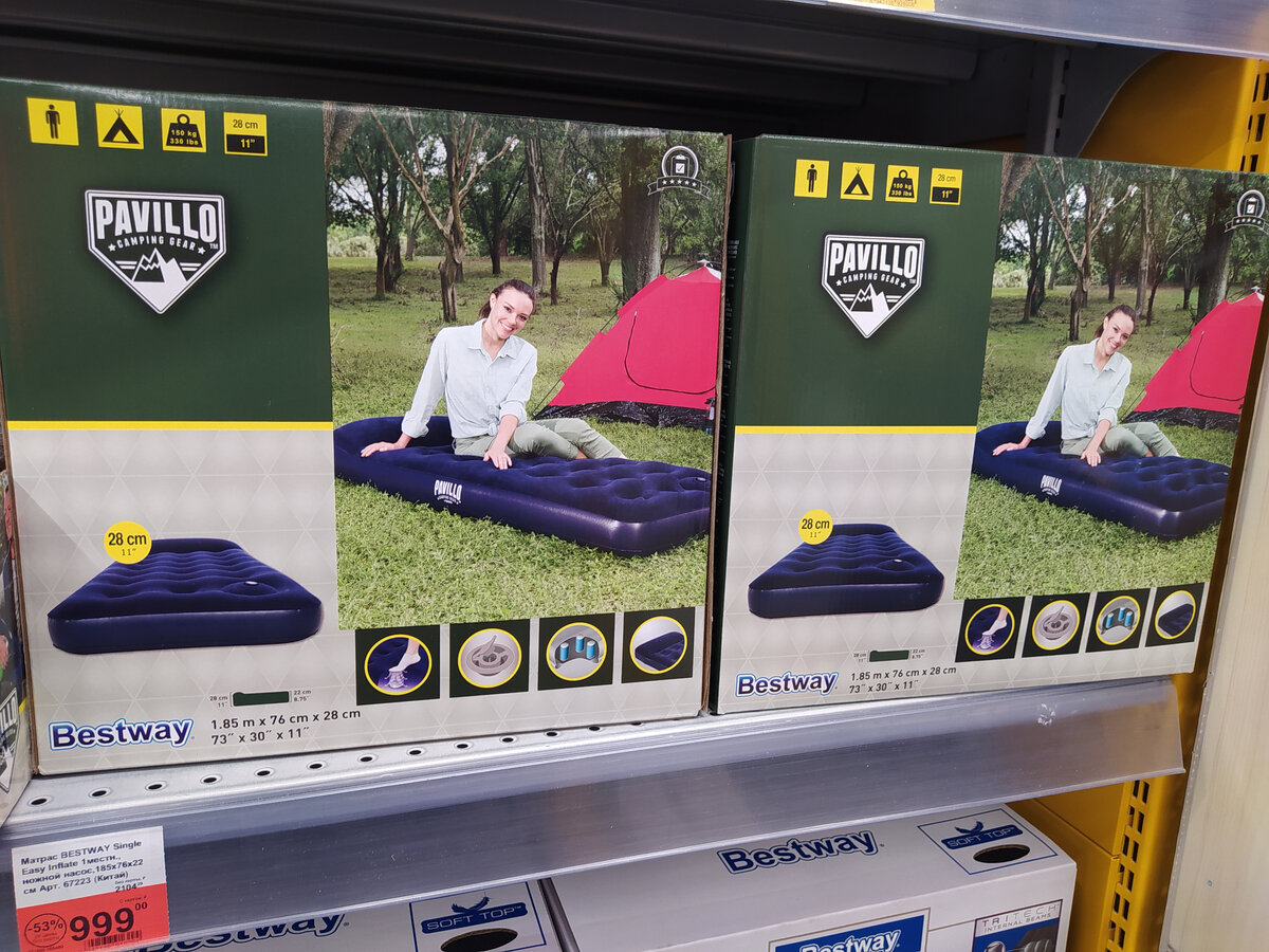 Заехала в Ленту за продуктами и зашла в отдел с туристическими товарами. Обрадовали скидки на очень большое количество товаров. Показываю, что увидела интересного. 1. Матрасы надувные 1.85м*76см*28см Односпальный матрас, в комплекте ножной насос. Цена 1000 руб. Есть и двухспальный размером 2,03м*1,52м*28 см цена 2199 руб. 2. Портативная газовая плита Маленькая плитка. Можно быстро вскипятить чай или приготовить завтрак. Незаменима в местах, где трудно найти дрова или нельзя разводить костры. Цена 1199 руб. 3. Топорик Fiskars Небольшой топорик известной фирмы. Качество отличное, я давно пользуюсь продукцией Fiskars, никаких нареканий нет. Топорик в комплекте с чехлом - удобно. Цена 3499 руб. 4. Дождевики Большой выбор дождевиков по разным ценам и из разного материала и различных расцветок. Цены: 299, 699 руб. 5. Спальные мешки Огромный выбор спальных мешков. Есть даже с подушкой. Размеры разные, имеются для высоких людей - 203 см. Температурные режимы также разные от -1 градуса по цель