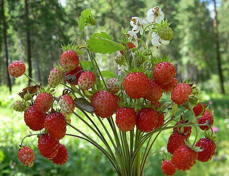 В лесах России встречается огромное множество разновидностей ягод, пригодных к употреблению. Они очень полезны благодаря содержанию в них макро-, микроэлементов и витаминов. Сбор начинают с июня до поздней осени, пока не выпадет первый снег. Земляника лесная. Земляника растет в европейской части страны, Западной и Восточной Сибири, на Кавказе и в Средней Азии. Высота достигает 15 см. На коротком стебле почти до земли свисают красные плоды вытянутой формы. Листья тройчатые, темно-зеленые. Цветет с мая по июль соцветиями белого цвета. Сезон сбора начинается с конца июня. В землянике много сахара, органических кислот и клетчатки, солей железа, фосфора, кальция, витаминов группы B, каротина, аскорбиновой и фолиевой кислоты. Употребление свежей ягоды способствует нормализации пищеварения, устранению воспалительных и язвенных процессов. Она применяется при болезнях мочеполовой системы, желчнокаменной болезни, диабете, заболеваниях органов пищеварения. Малина лесная. Малина растет в лесах