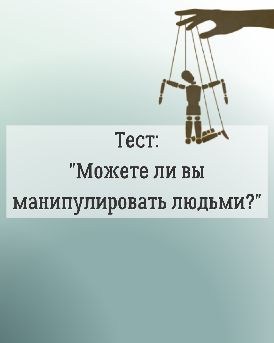 Можете ли вы манипулировать людьми? Манипуляция – это одна из разновидностей воздействия (осознанного или неосознанного) на людей с целью изменить их поведение или же заставить их делать то, что нужно, удобно или выгодно манипулятору. А вы воздействуете на людей? 1. Вы отличаетесь целеустремленностью? А) Конечно. Б) Не всегда. В) Нет. 2. По вашему мнению, должен ли человек всегда поступать так, как захочет? А) Да. Б) В зависимости от обстоятельств. В) Если это ему выгодно. 3. Вы придерживаетесь в отношениях с другими людьми принципа «цель оправдывает средства»? А) Да. Б) Иногда. В) Нет. 4. Легко ли вас заставить поменять свое мнение? А) Практически невозможно. Б) Когда как. В) Легко. 5. Вы считаете, что в жизни следует руководствоваться принципом здорового эгоизма? А) Да. Б) Иногда. В) Нет. 6. Вы обладаете даром убеждения? А) Да. Б) Иногда. В) Нет. 7. Вы способны отстаивать свои интересы? А) Конечно. Б) Не всегда. В) Нет. 8. Иронизируете ли вы над самоуве
