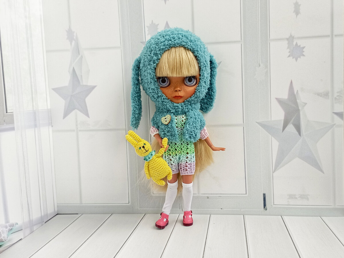 Вам потребуется: Комбинезон мы связали тут. Шубка. Набираем 20 петель. Первый ряд вяжем лицевыми. 2 ряд. 3 лиц, пр, 2 лиц, пр, 4 лиц, пр, 2 лиц, пр, 3 лиц. 3 ряд и все нечëтные. Лицевые. 4 ряд. 4 лиц, пр, 4 лиц, пр, 6 лиц, пр, 4 лиц, пр, 4 лиц. 6 ряд. 5 лиц, пр, 6 лиц, пр, 6 лиц, пр, 6 лиц, пр, 5 лиц. 8 ряд. 6 лиц, пр, 8 лиц, пр, 8 лиц, пр, 8 лиц, пр, 6 лиц. 10 ряд. 8 лиц, 10 петель снимаем на булавку, набираем воздушным набором 2 петли, 12 лиц, 10 петель снимаем на булавку, набираем воздушным набором 2 петли, 8 лиц. Дальше вяжем 9 рядов лицевыми. Петли закрываем. Рукав. Снимаем с булавки 10 петель и набираем из подреза ещё 4 петли. Вяжем 4 ряда лицевыми. Петли закрываем. Шапка. Вяжем поворотными рядами на 2 спицах. Набираем 82 петли и вяжем 10 рядов платочной вязкой. 11 ряд. Закрываем первые 15 петель, 67 лиц. 12 ряд. Закрываем первые 15 петель, 52 лиц. Ещё 20 рядов лицевыми. 33 ряд. Кром, 45 лиц, оборачиваем петлю рабочей нитью (переснимаем петлю с левой спицы на пр