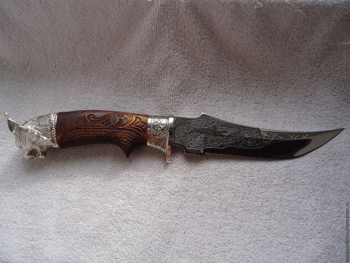 Классический Боуи из моей коллекции имеет длину клинка 300 мм, ширину 45 мм и толщину 6 мм. Гарда и навершие рукояти из нержавейки, клинок из стали Х12МФ, накладка рукояти из рога оленя. Сам нож цельнометаллический, тушку курицы разрезает в два раза.
